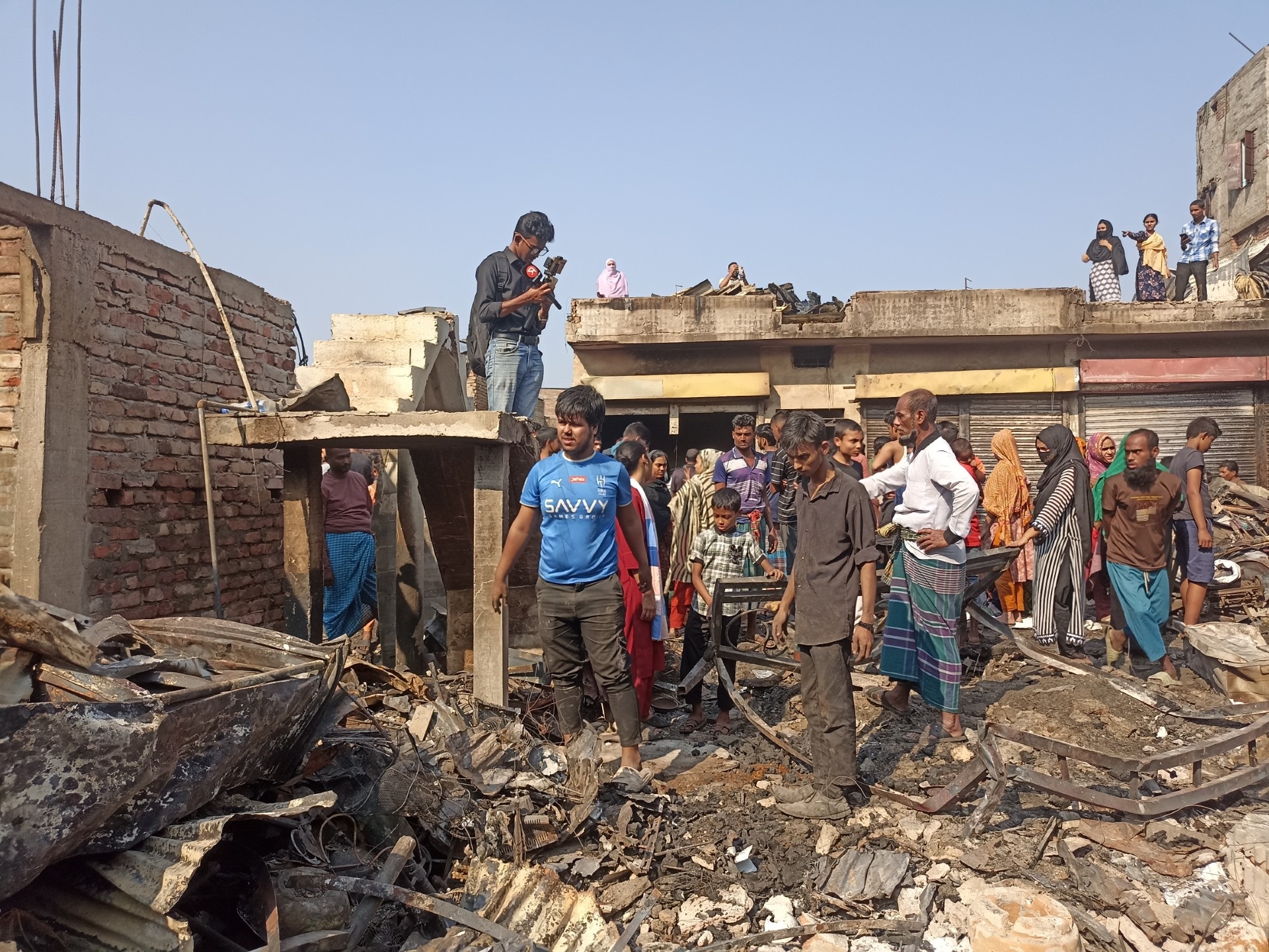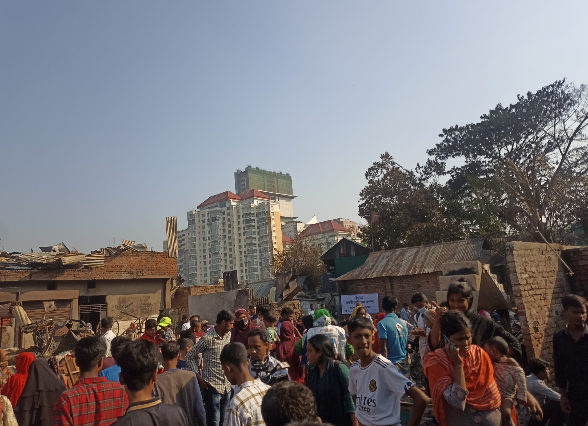 প্রায় ২৪ ঘণ্টা হতে চলেছে। এই আগুনে পুড়েছে কয়েক শতাধিক ঘরবাড়ি। ক্ষতিগ্রস্তরা এখন খোলা আকাশের নিচে বসে সময় কাটাচ্ছেন। কেউ কেউ পোড়া টিন, মালপত্র সরাচ্ছেন।
