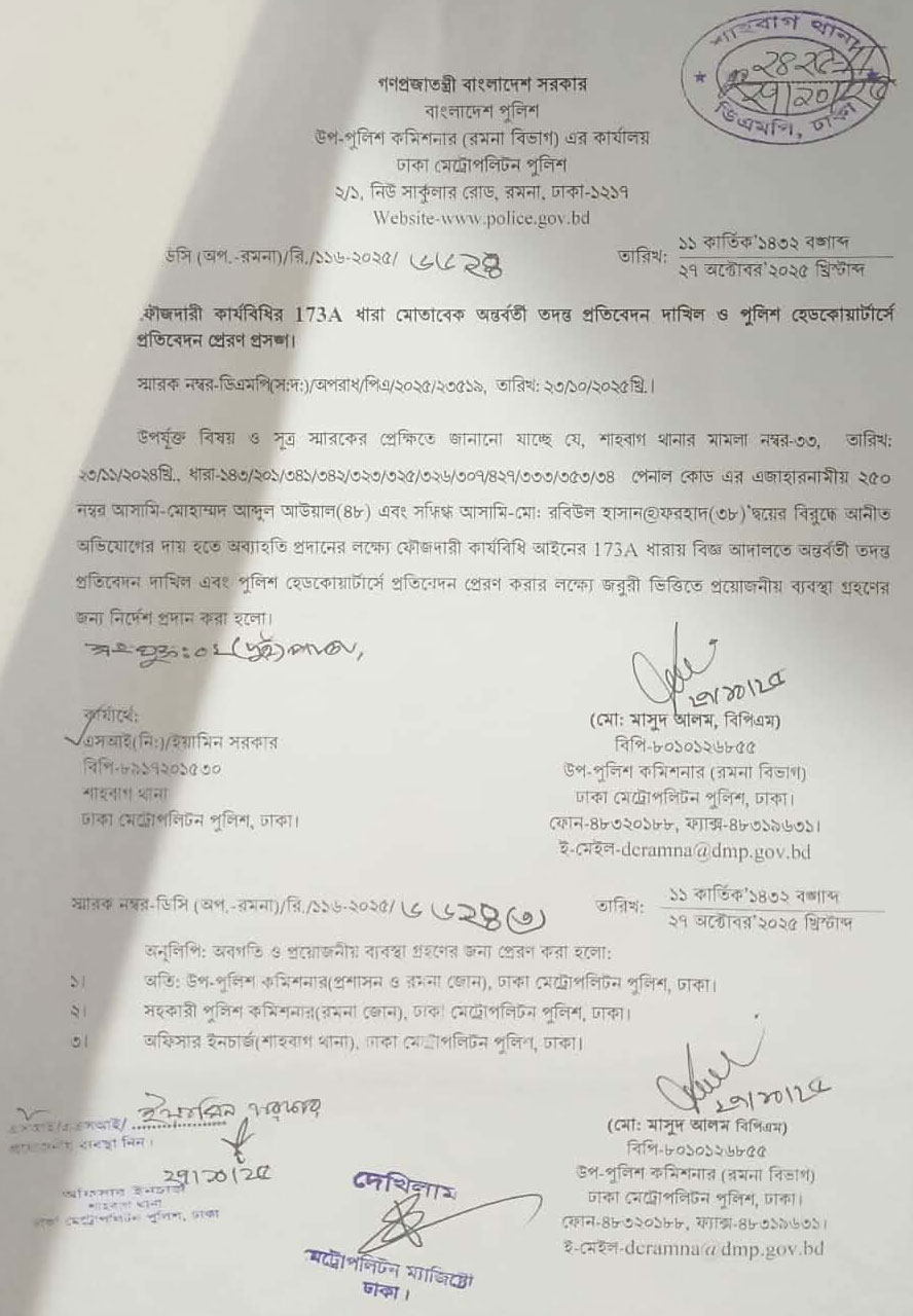 এ বিষয়ে শাহবাগ থানার (৩৩ নং মামলা) মামলার তদন্তকারী কর্মকর্তা উপপরিদর্শক (এসআই) হাসানুজ্জমান ঢাকা মেইলকে বলেন, ‘আমি এখনো চার্জশিট দেইনি। আগের কর্মকর্তা (এসআই ইয়ামিন) একটি কাগজ পুলিশ সদর দফতরে পাঠাইছিল। আমি বিষয়টি তদন্ত করছি। তার আওয়ামী লীগের সঙ্গে যুক্ত থাকার সংশ্লিষ্ট পাওয়া যাচ্ছে। চূড়ান্ত প্রতিবেদন এখনো আদালতে জমা দেওয়া হয়নি। যেটা আগে দেওয়া হয়েছিল সেটা হলো কোন আসামিকে প্রাথমিক জিজ্ঞাসাবাদের পর তার সংশ্লিষ্টতা না থাকলে একটা কাগজ দেওয়া হয় সেটা দেওয়া হয়েছিল আরকি।’