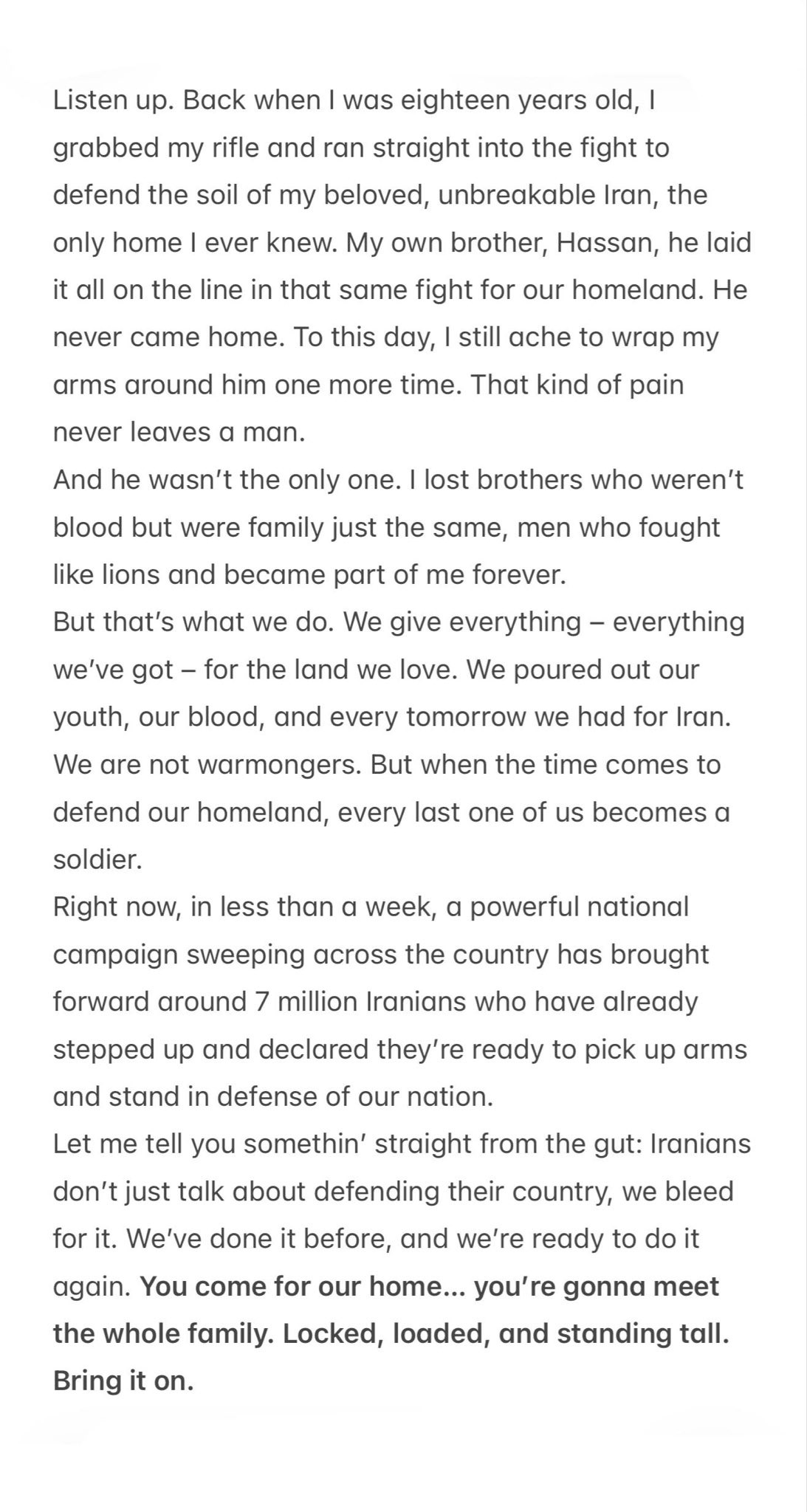 বৃহস্পতিবার (২ এপ্রিল) সামাজিক যোগাযোগমাধ্যম এক্সে দেওয়া এক পোস্টে তিনি বলেন, ‘ইরান যুদ্ধ চায় না, কিন্তু আক্রান্ত হলে দৃঢ়ভাবে আত্মরক্ষা করবে। যখন দেশের প্রতিরক্ষা বিপন্ন হয়, তখন সকল ইরানি সৈনিকের মতো কাজ করতে প্রস্তুত থাকে।’