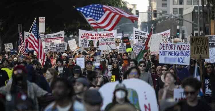 শনিবার (১০ জানুয়ারি) ক্যালিফোর্নিয়ার লস অ্যাঞ্জেলেসে বিক্ষোভে নামে হাজারও মানুষ/ ছবি: এএফপি যুক্তরাষ্ট্রের মিনিয়াপোলিসে অভিবাসন ও কাস্টমস এনফোর্সমেন্ট (আইস) কর্মকর্তার